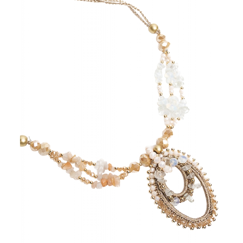 Collar medio en trabajo de crochet y chips piedras naturales con centro de dos óvalos y cuentas, en color natural con dorado.