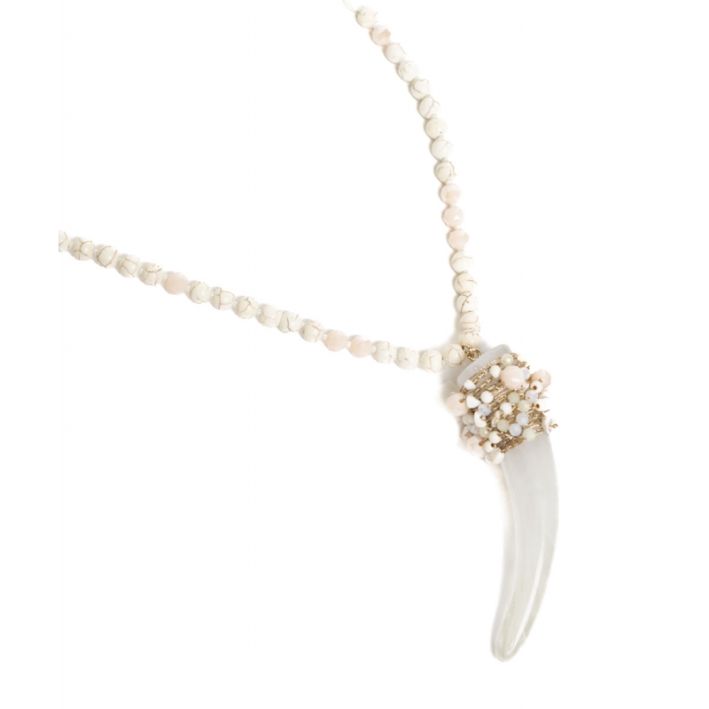 Collar largo de cuentas de piedra natural y centro en forma de cuerno con tejido de cuentas facetadas, en color blanco con dorado.