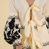 Conjunto beig de blusa y pantalón con bordados en negro. Blusa con lazada delantera.