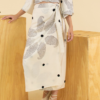 Falda beig con estampado y bordado negro.