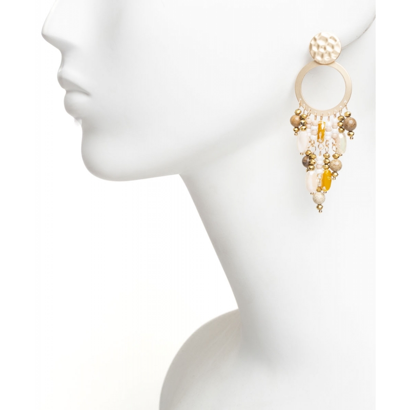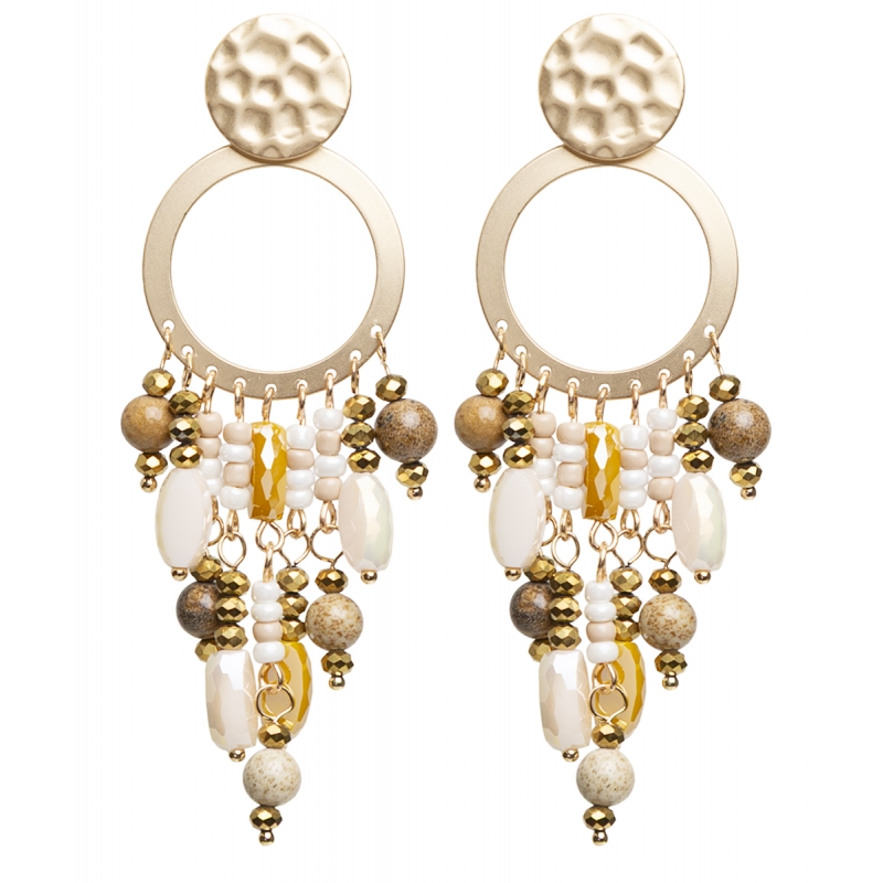 Pendiente con post redondo de metal texturado acabado mate, con círculo calado y lluvia de cuentas y piedras naturales, en color beig con dorado.