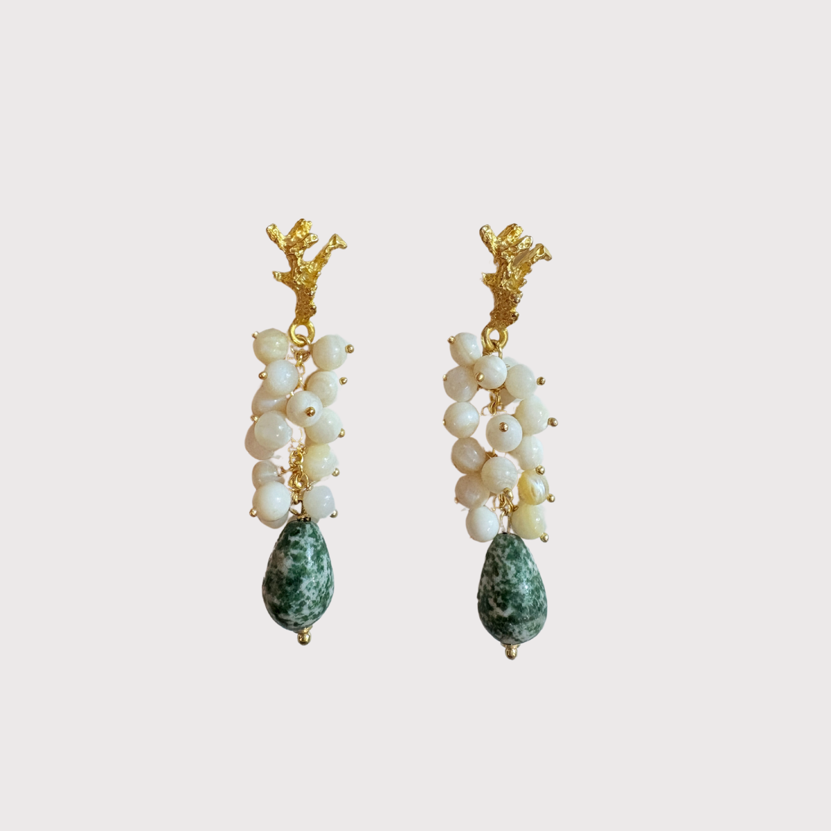 Pendientes con base dorada en forma de coral, del que cuelgan piedras en blanca y una lágrima de cerámica marmolizada verde. Diseño de Karinna Saona.