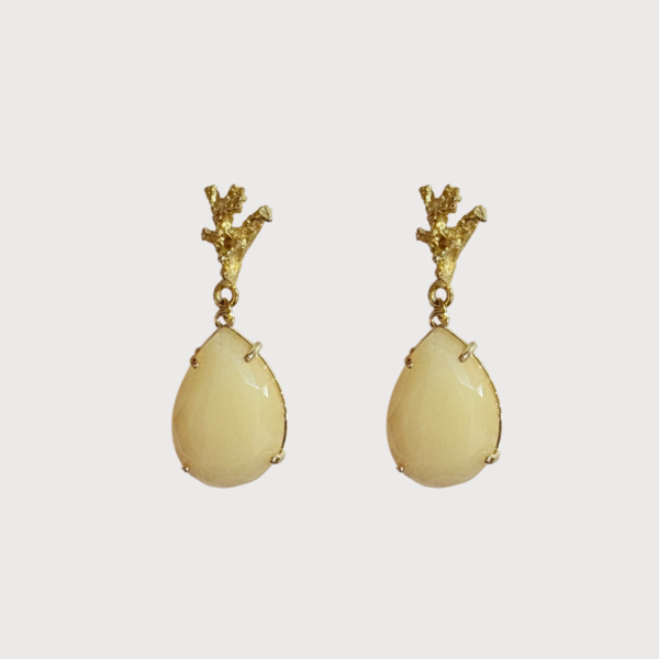 Pendientes con base de coral dorada y piedra en forma de lágrima color beige. Diseño de Karinna Saona.