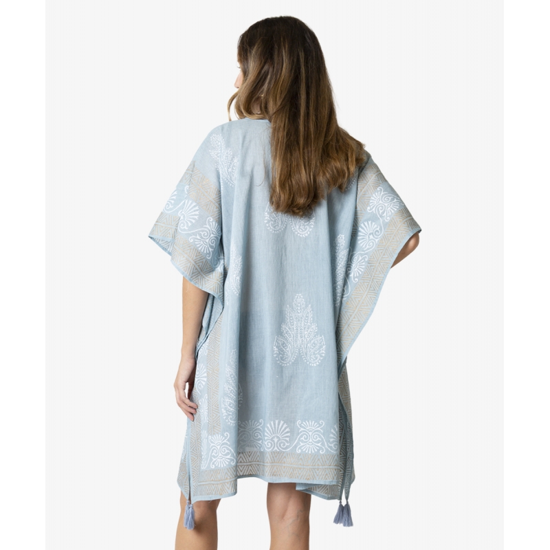 Poncho en tejido de algodón natural, en azul denim con efecto lavado, con estampados «block print» hechos a mano en «foil» dorado y blanco, escote de pico y borlas en las cuatro esquinas.