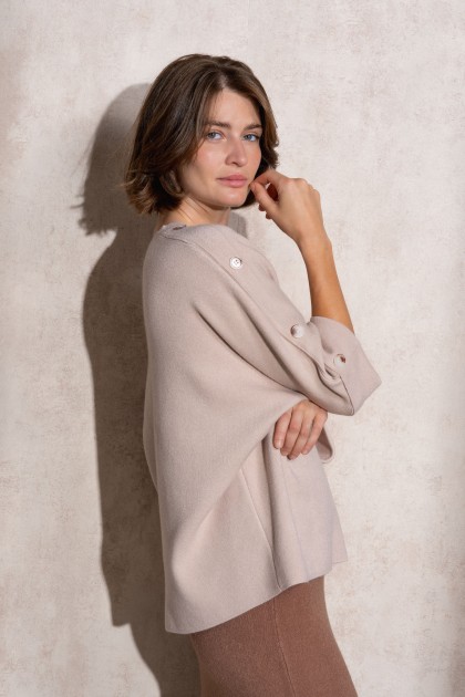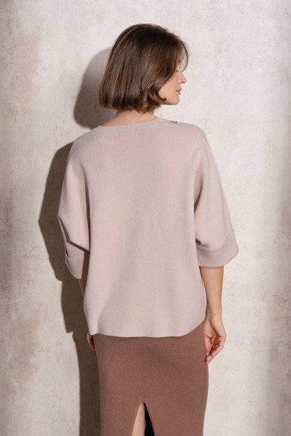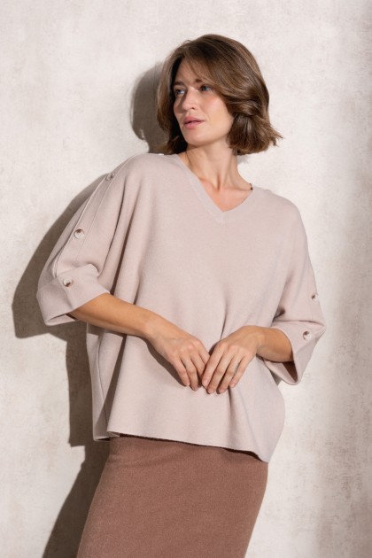 Suéter de punto color beige, con detalle de botones en la manga y cuello de pico.